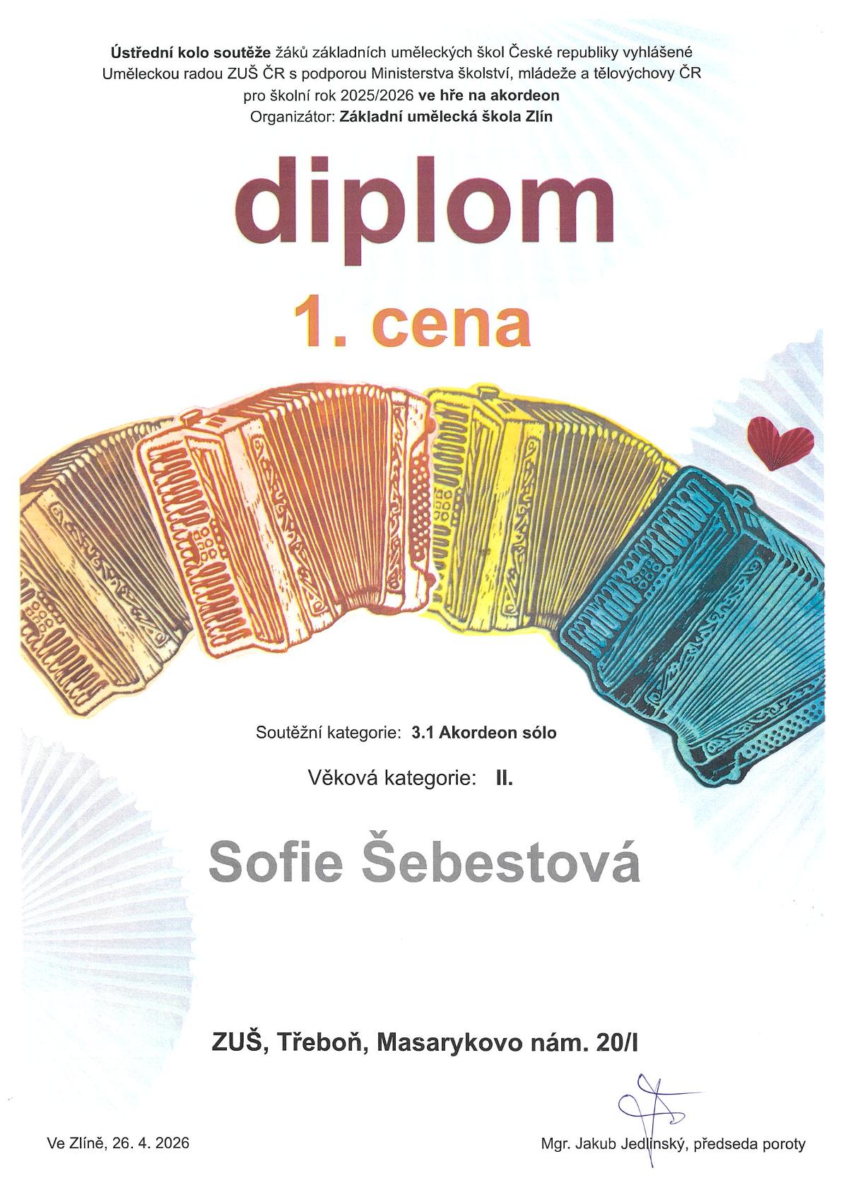 Ve dnech 24. - 26. dubna proběhlo ve Zlíně Ústřední kolo ve hře na akordeon. Zde zazářila naše žačka Sofie Śebestová, která si přivezla 1. cenu. Sofii gratulujeme a její paní učitelce Lence Slaninové děkujeme za vynikající pedagogickou přípravu!!